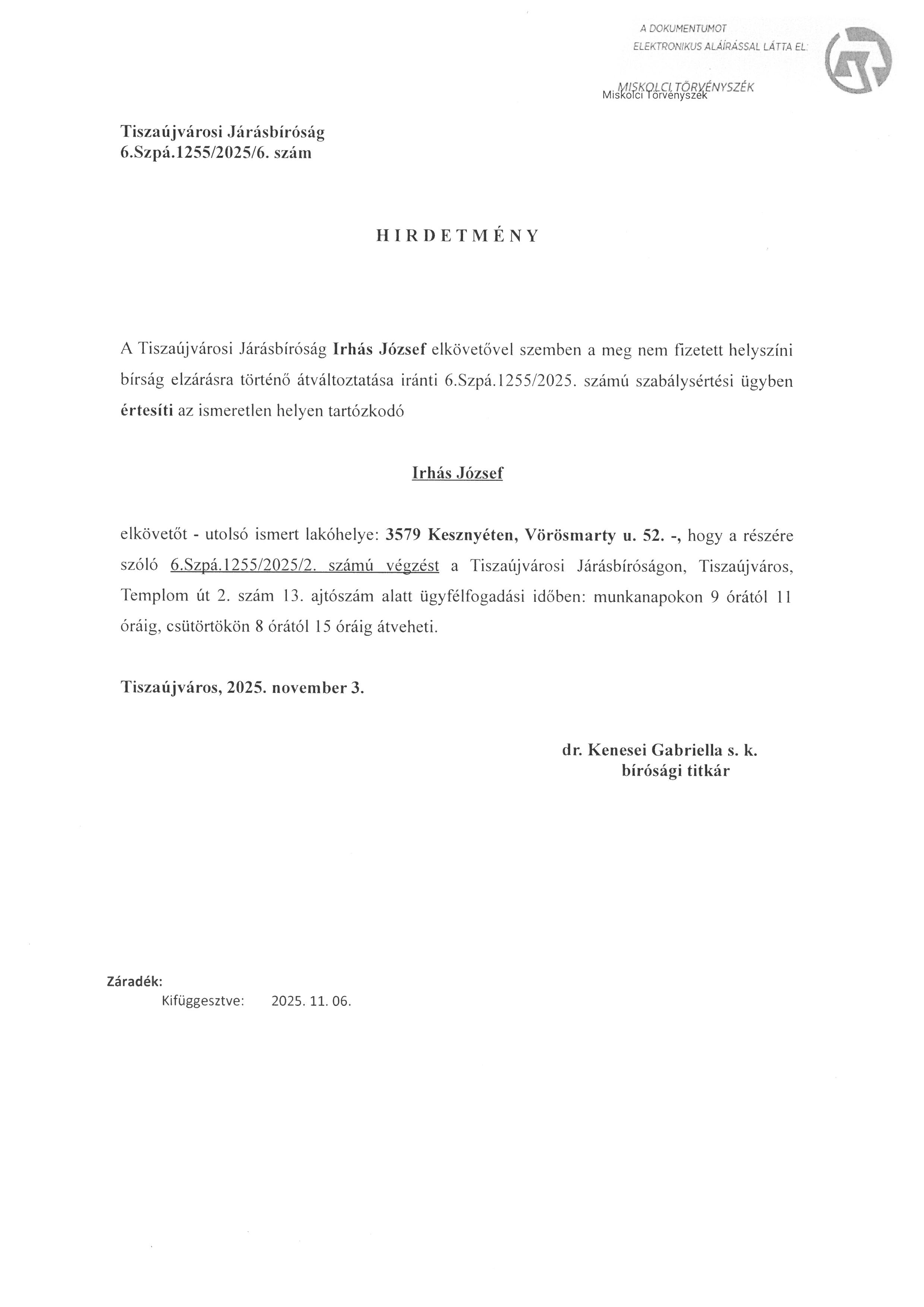 Hirdetményi úton történő kézbesítés Irhás József részére