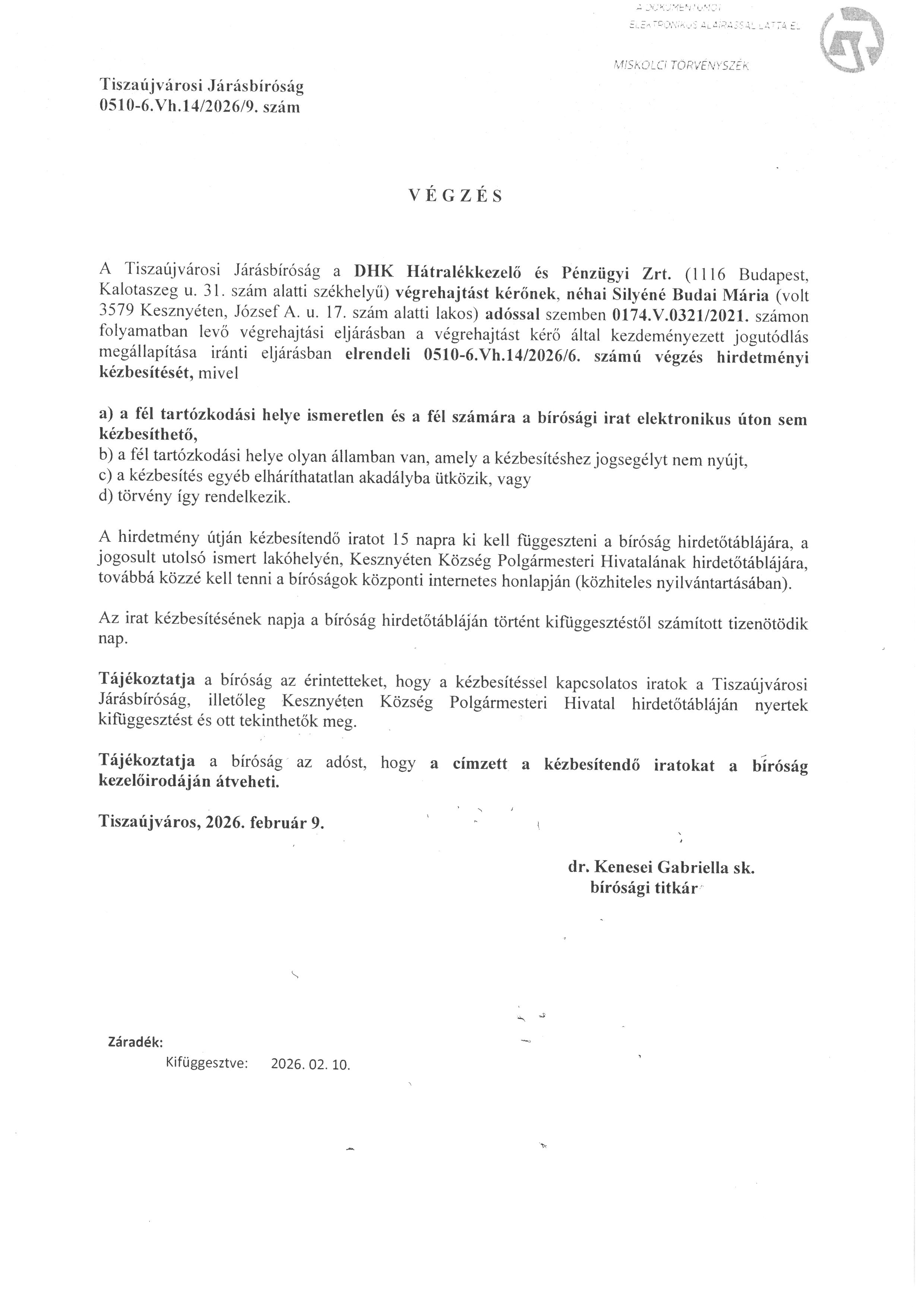 0510-6-Vh.14/2026/6. számú végzés hirdetményi úton történő kézbesítése